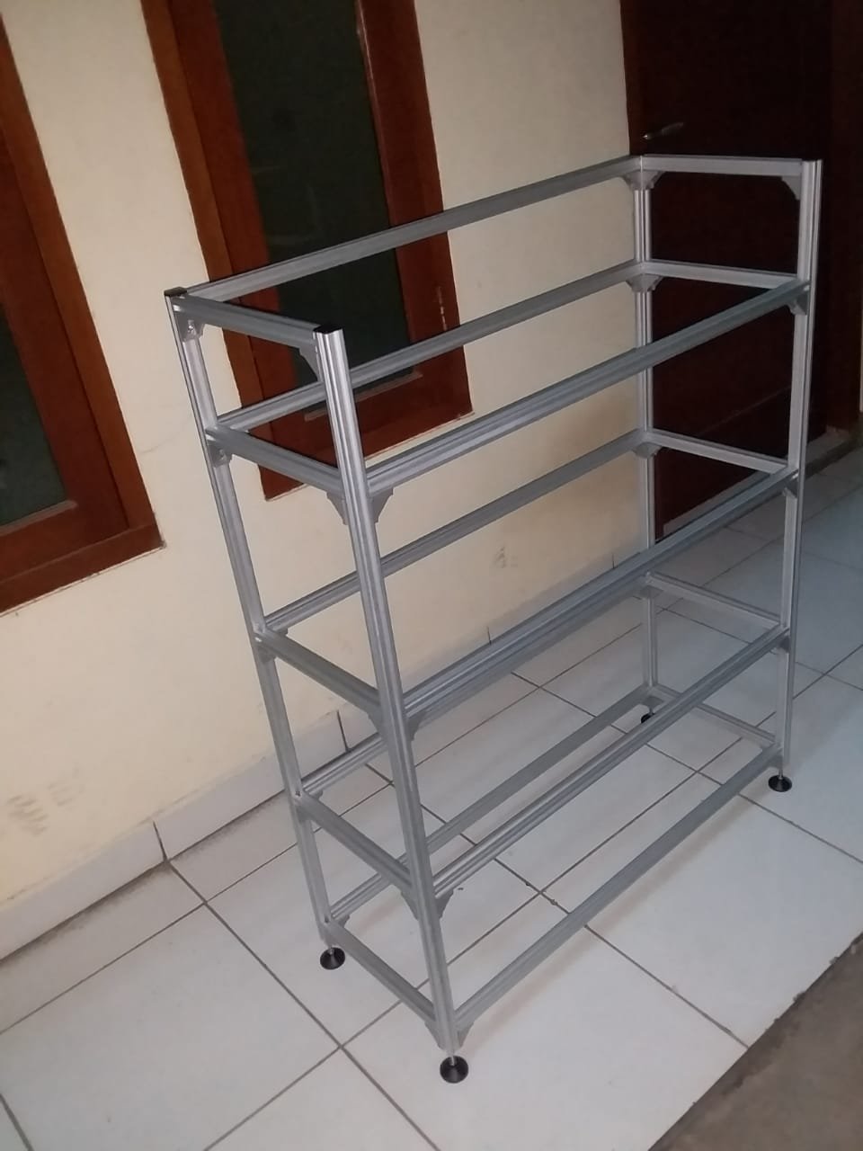 Hanya pakai Alumunium Profile 2020, rangka rack 4 susun ini cukup kuat untuk menahan beban sekitar 100 Kg.