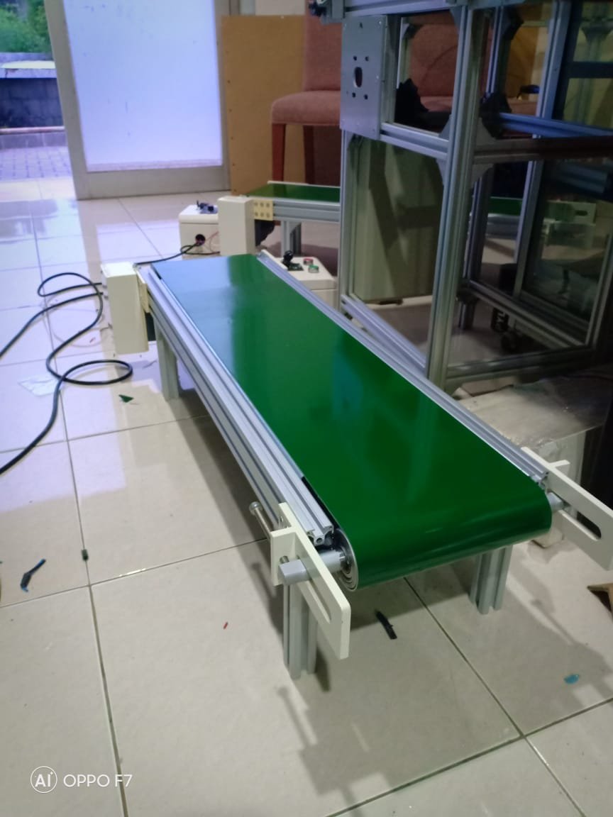 Conveyor panjang 1m, lebar 28cm. Rangka aluminium profile 3030 dan 3060.