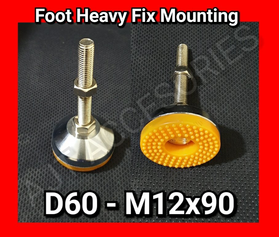 Foot adjuster / kaki meja untuk beban berat. Ukuran diameter tapak 60mm, ukuran baut M12 dan panjang baut 90mm. Sangat cocok untuk rangka alumunium profile