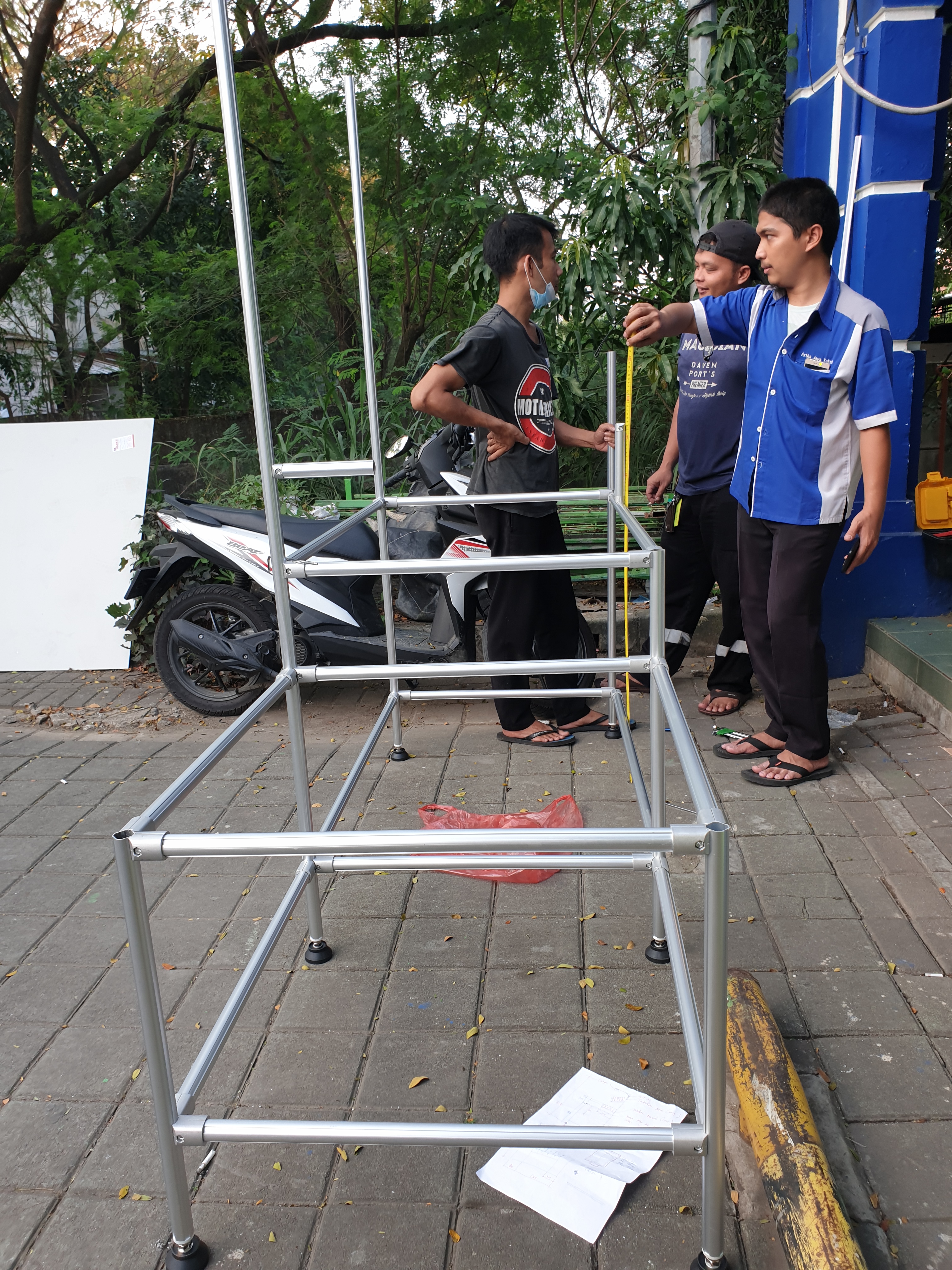 Pekerjaan fabrikasi meja inspeksi rangka aluminium pipa diameter 28mm, tebal 1,7mm.